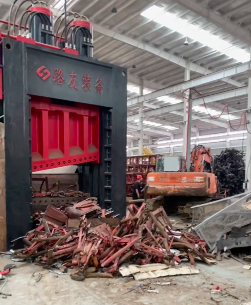 路友廢鋼龍門剪正在對建筑工地管架、貨車車架及馬路欄桿等結(jié)構(gòu)的剪切作業(yè)