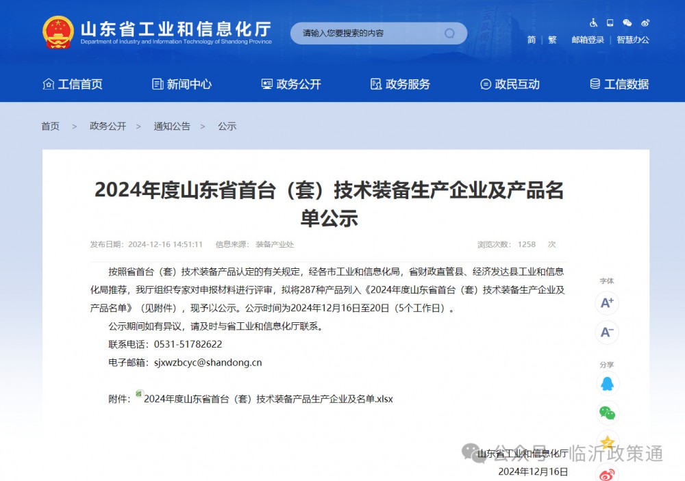 按照省首臺(套)技術(shù)裝備產(chǎn)品認定的有關規(guī)定,經(jīng)各市工業(yè)和信息化局,省財政直管縣、經(jīng)濟發(fā)達縣工業(yè)和信息化局推薦,我廳組織專家對申報材料進行評審,擬將287種產(chǎn)品列入《2024年度山東省首臺(套)技術(shù)裝備生產(chǎn)企業(yè)及產(chǎn)品名單》(見附件),現(xiàn)予以公示。公示時間為2024年12月16日至20日(5個工作日)。
