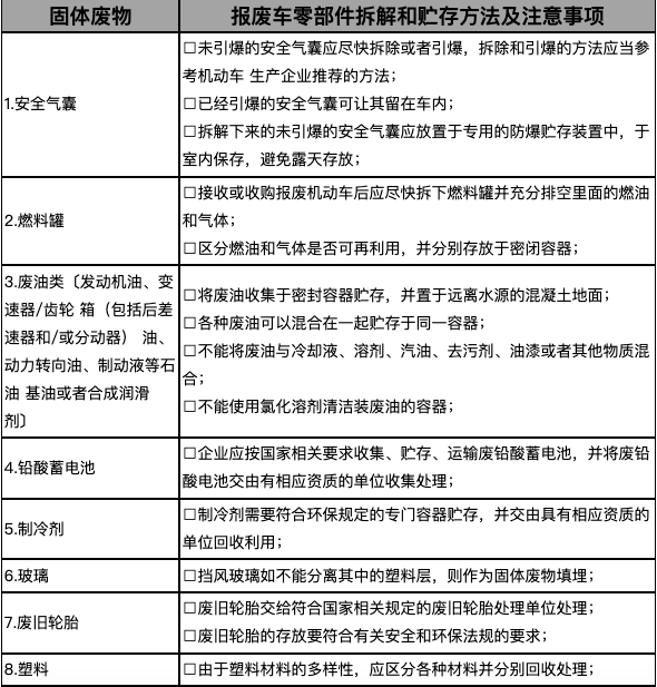 回收拆解企業(yè)拆解的尾氣后處理裝置、危險廢物應當如實記錄,并交由有處理資質(zhì)的企業(yè)進行拆解處置,不得向其他企業(yè)出售和轉(zhuǎn)賣。各固體零部件詳細拆解及處理方法見下表1